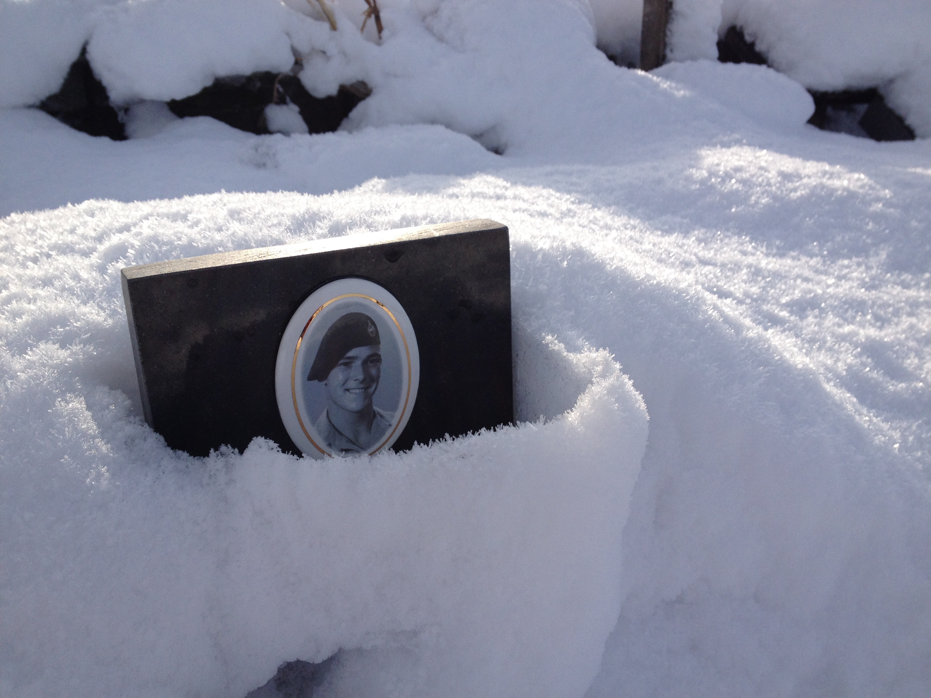 There’s a little memorial garden nearby to remember those who have fallen in more recent conflicts. The remembrance plaques are low to the ground so most are covered or partly covered by snow. Little gaps revealed engraved messages or peeks of photos; smiling young men in stiff uniforms.