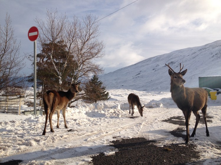 At the Cluanie Inn I slowed down to see if my old deer pas were about. Sure enough there they were, hanging out around the red telephone box and bins like a gang of misplaced teenagers.